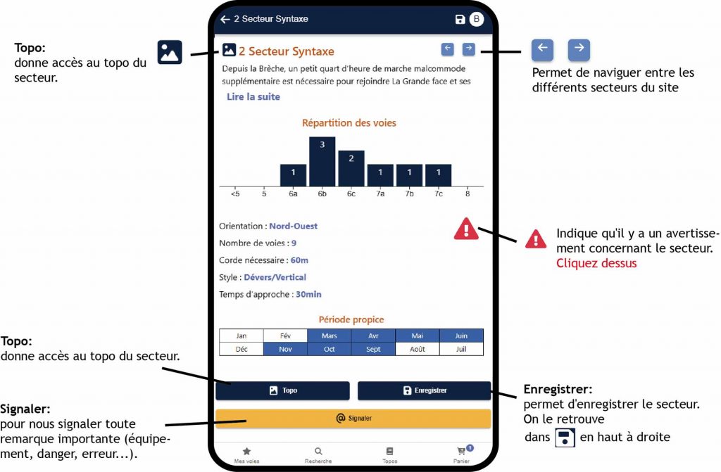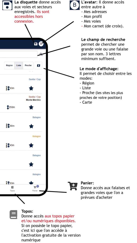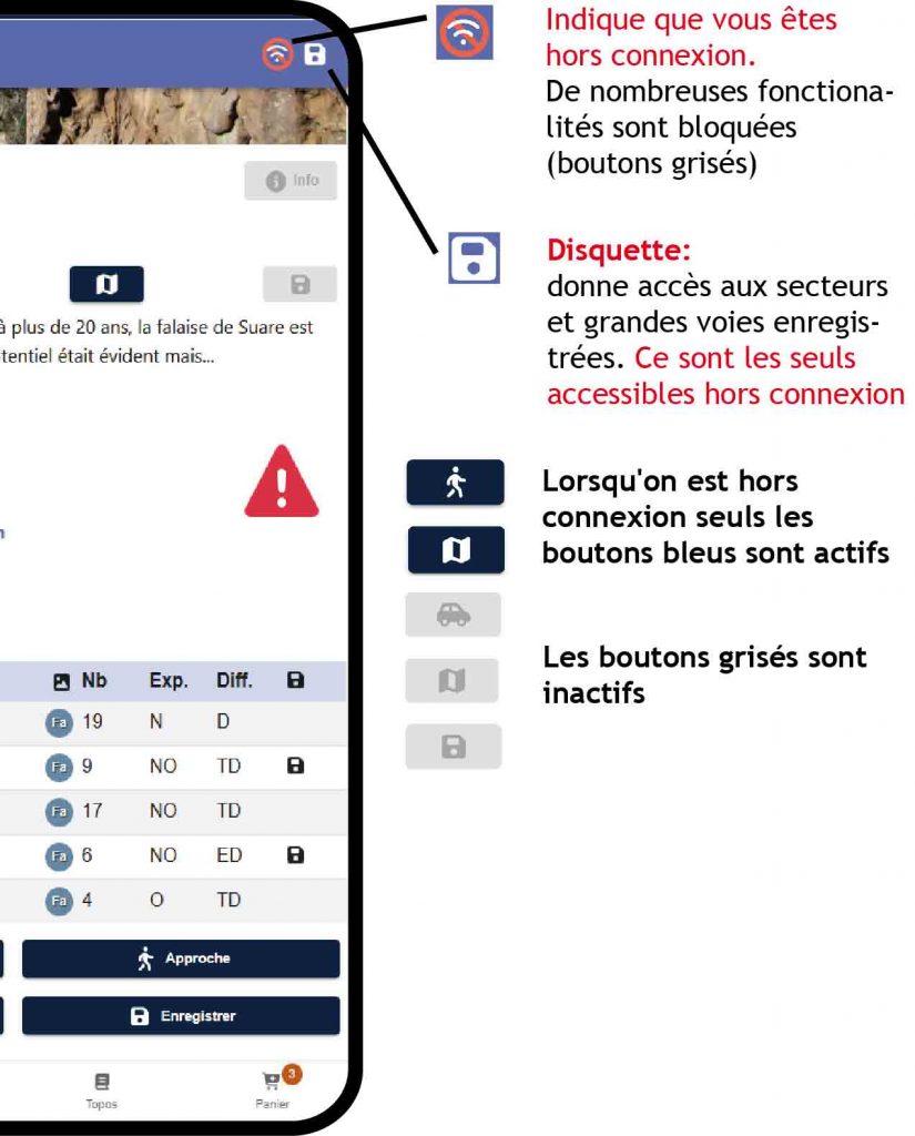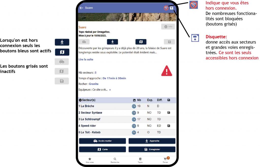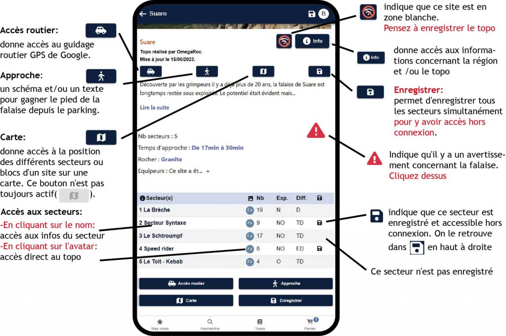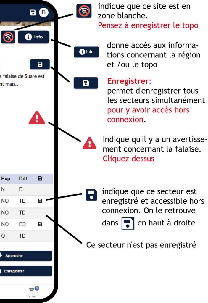 Attention, n’oubliez pas d’enregistrer vos falaises ou grandes voies à l’avance si celles-ci se trouvent en zone sans réseau. Voir bouton « Enregistrer » aux chapitres Site et Secteur ci-dessous.