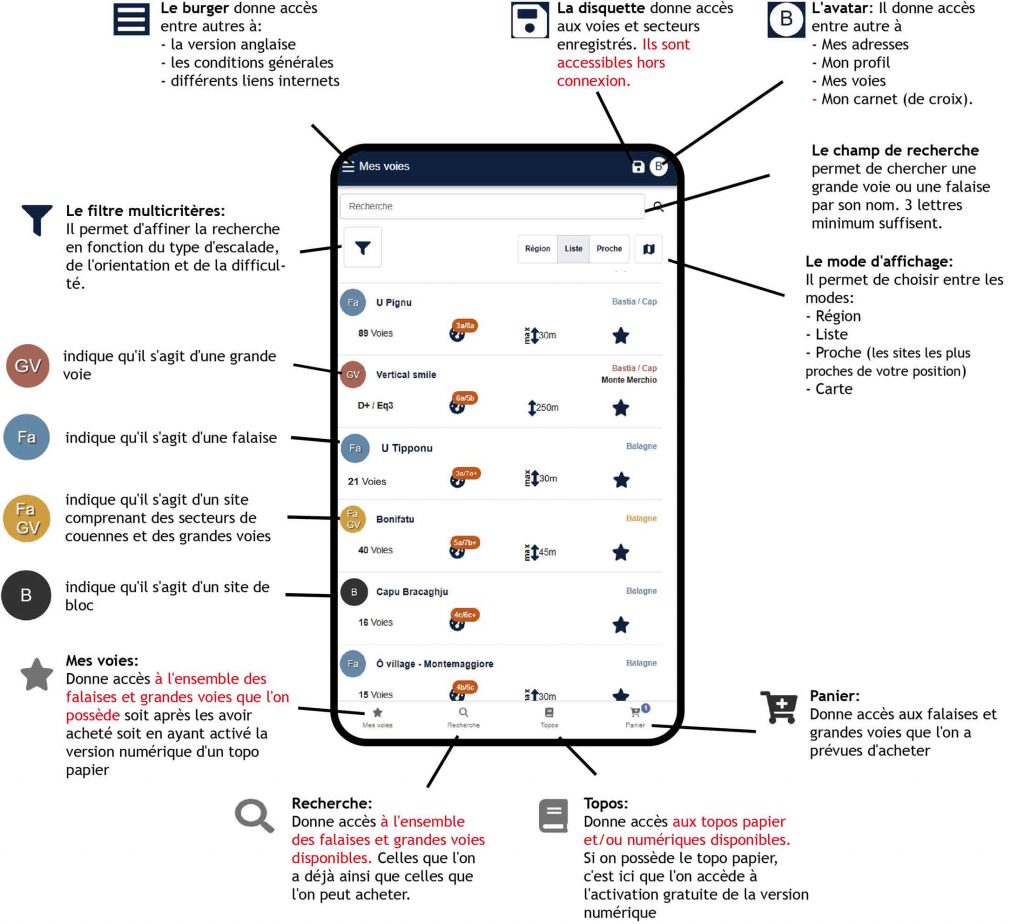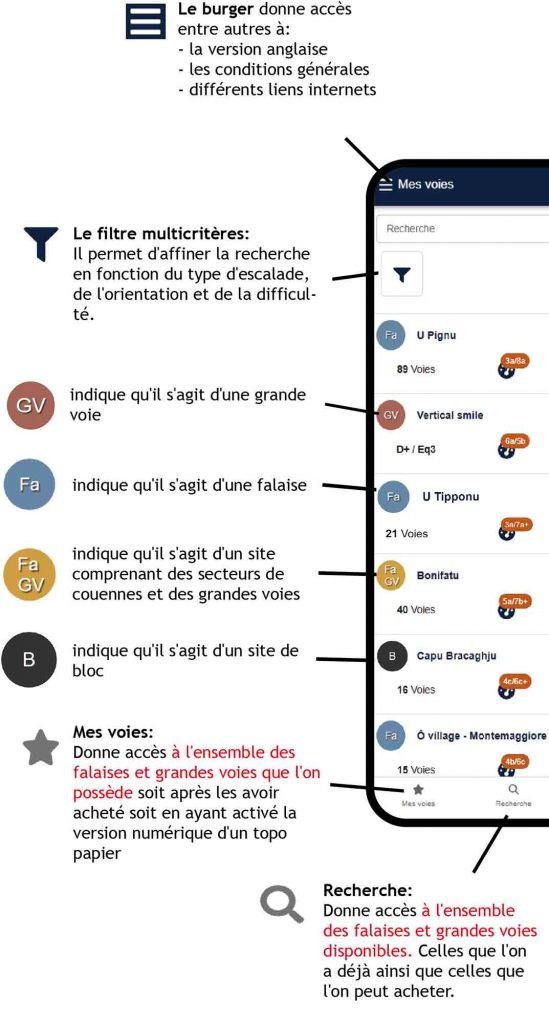 En quelques écrans, nous vous présentons les principales fonctions et la signification des différents pictogrammes. Nous espérons que cette appli vous donnera pleine satisfaction et trouvera toujours place au pied des falaises.