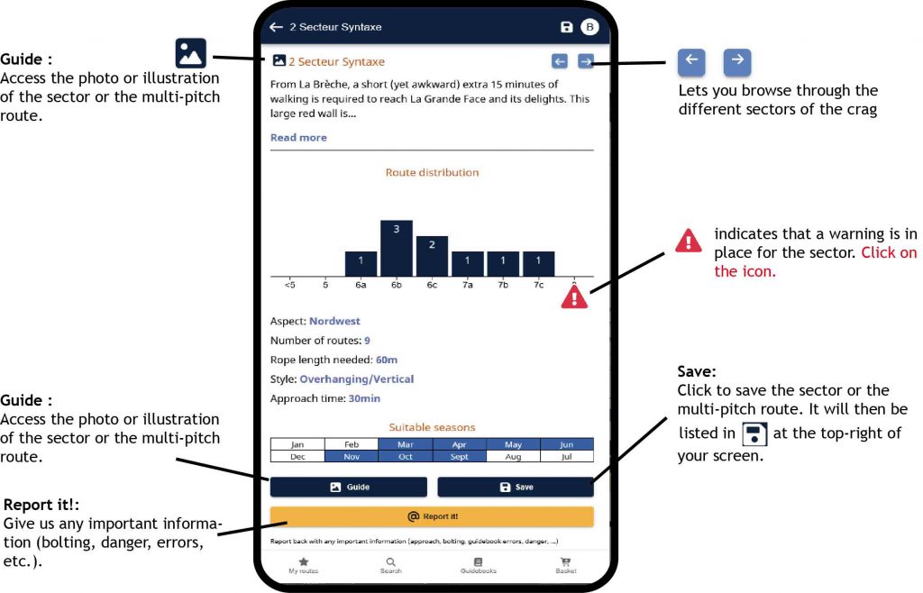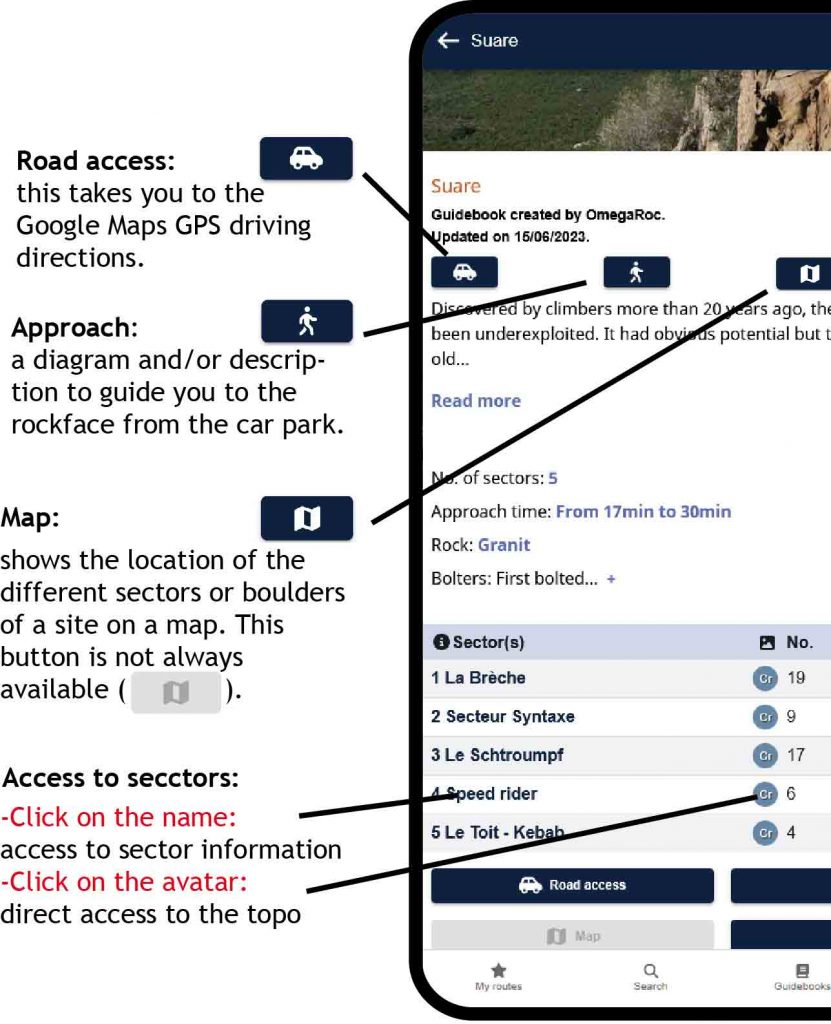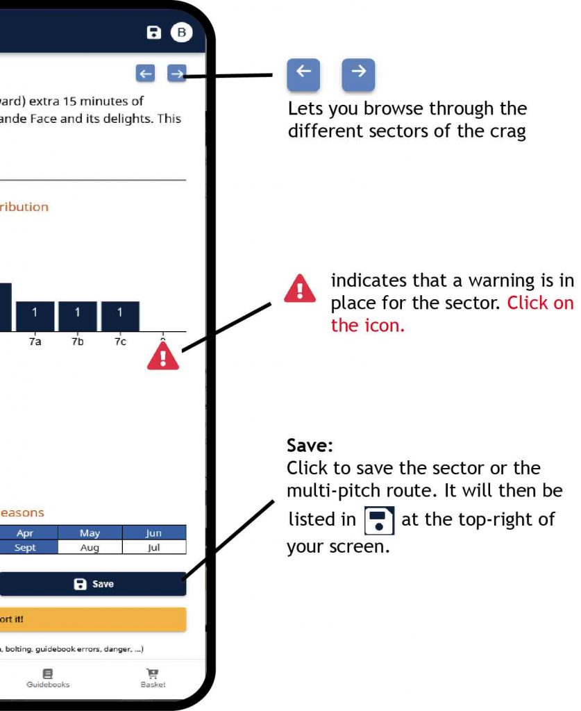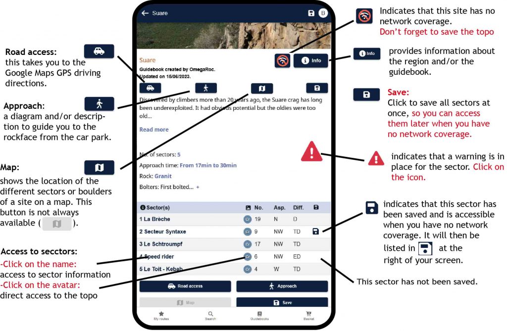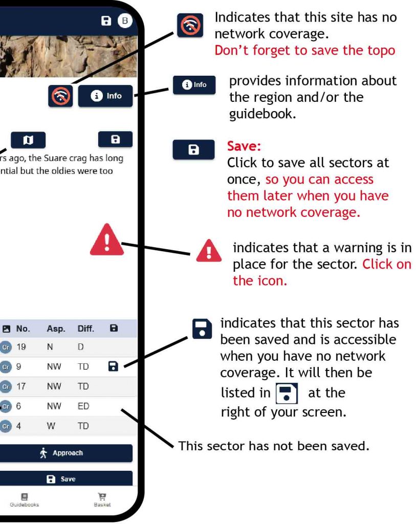 Important! – don’t forget to save your crags or multi-pitch routes in advance if they are in an area with no network coverage. See the “Save” button in the Site and Sector chapters, see below.