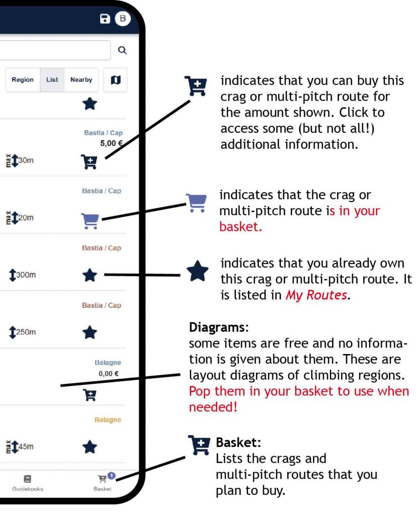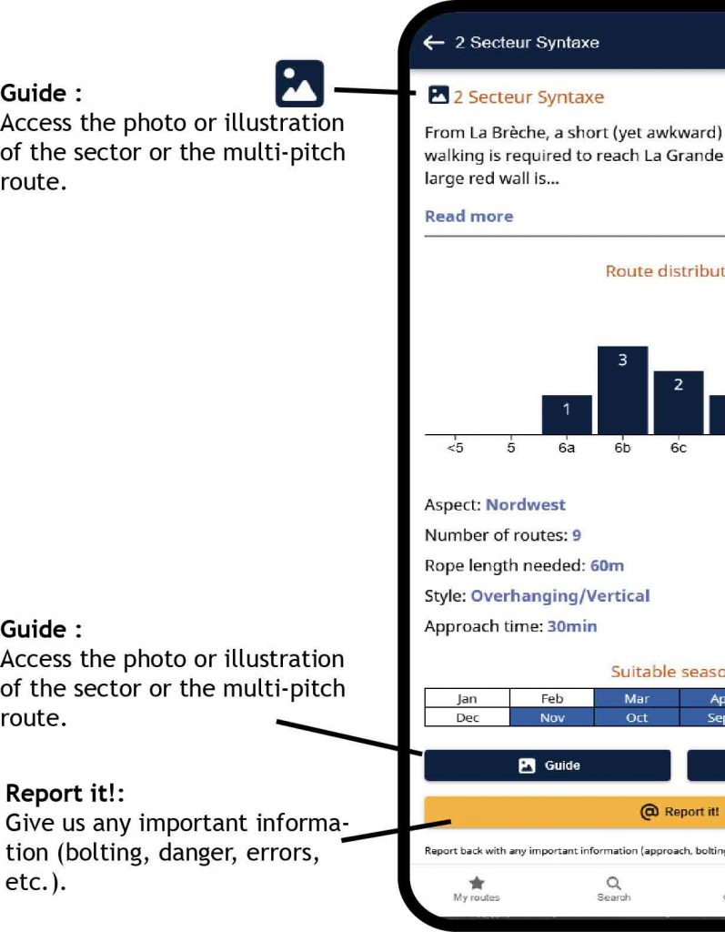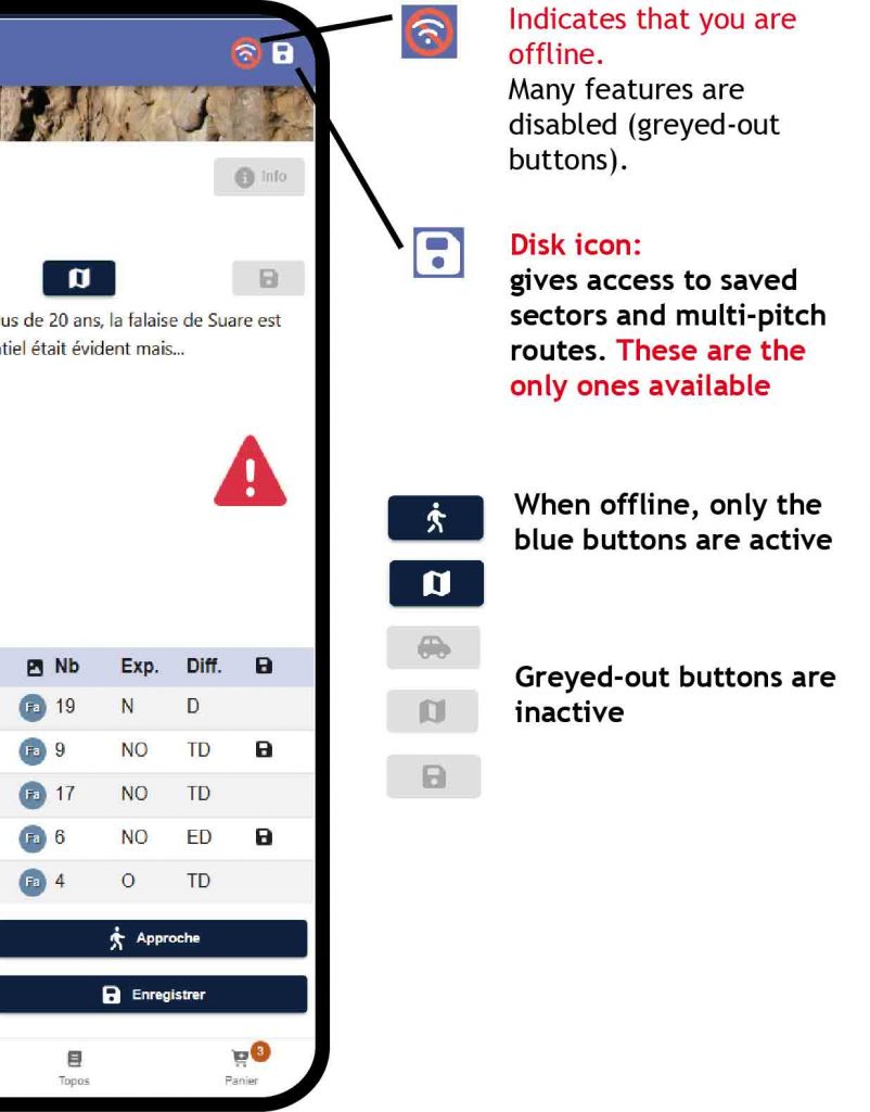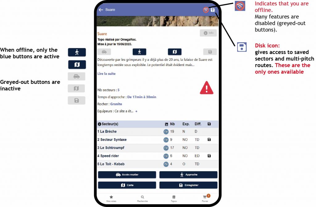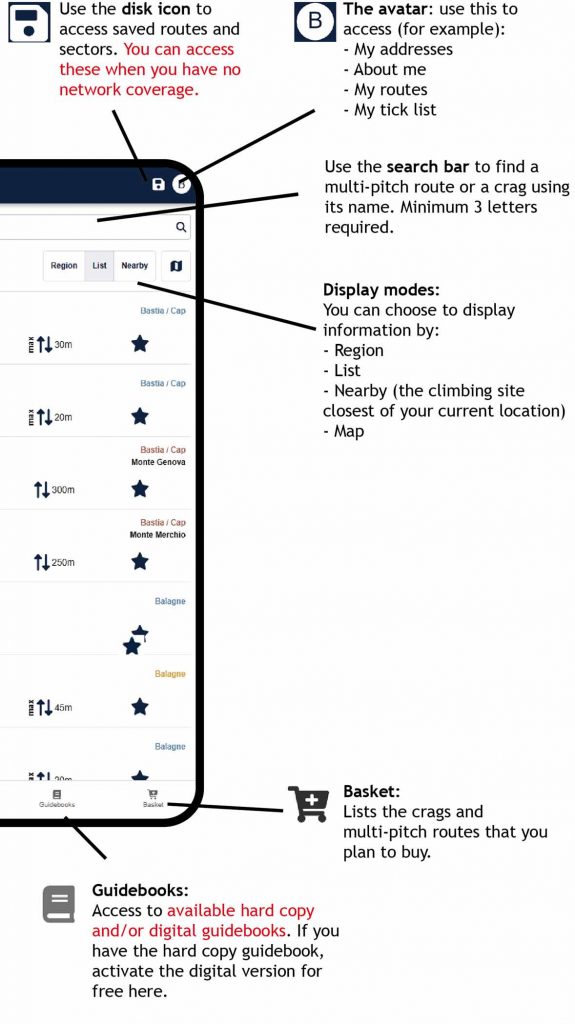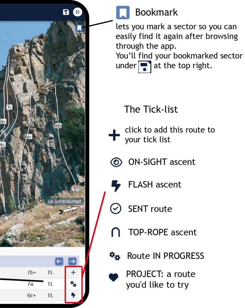 Important! – don’t forget to save your crags or multi-pitch routes in advance if they are in an area with no network coverage. See the “Save” button in the Site and Sector chapters, see below.