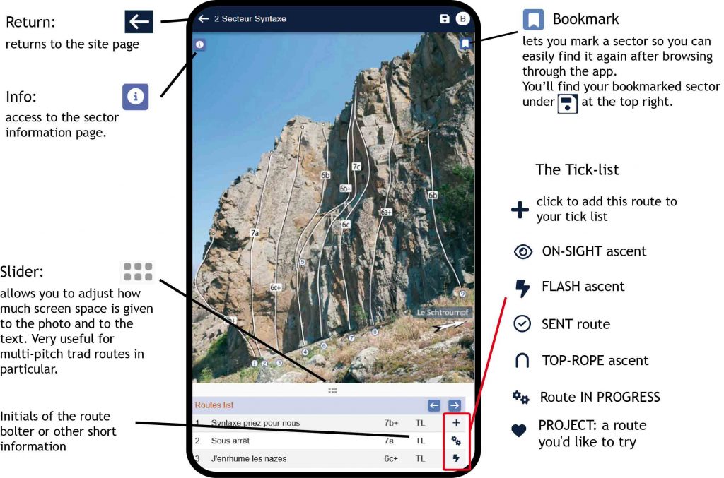 In just a few screens, we will take you through the main functions of the app and explain what the pictograms mean. We hope that you will be very satisfied with this app and it will be of great use to you out on the rock.